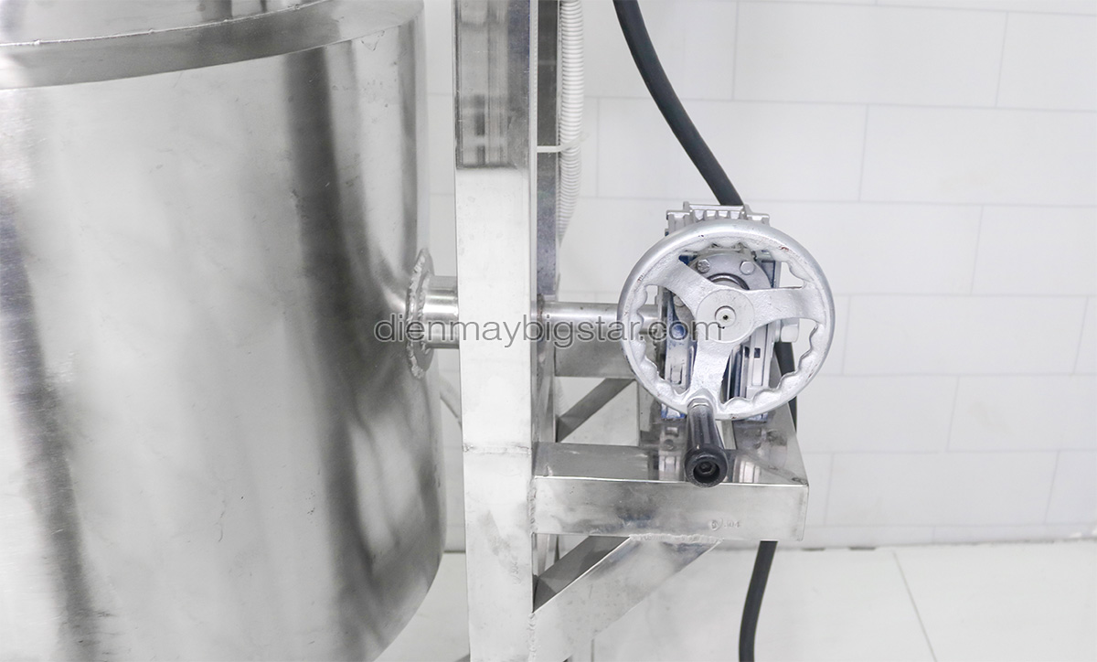 + Thân nồi có thể lật nghiêng với cơ chế tay quay bên cạnh thân, thuận tiện để xả liệu nhanh gọn các sản phẩm đặc sệt như mứt, mạch nha, các loại tương, sốt, sữa,… ra ngoài mà không lo tắc van xả hay đọng nguyên liệu.