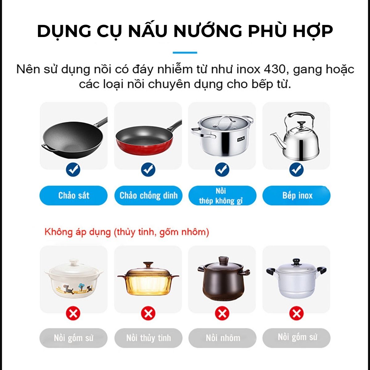 Trả lời: Chỉ dùng nồi có đáy nhiễm từ (inox, thép không gỉ) để bếp có thể hoạt động.